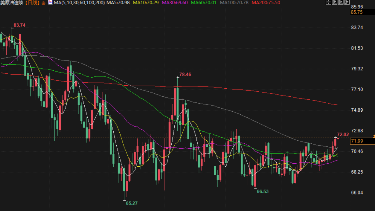 美原油微涨,交投于71.92美元/桶,受益于俄罗斯跨境天然气协议中断,引发欧洲冬季天然气需求担忧,本周接下来的交易日,油价有望持续多头走势。