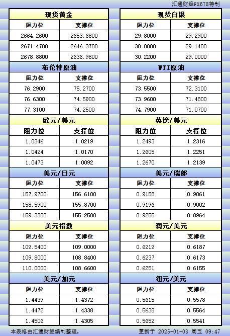 1月3日亚市更新的支撑阻力:金银原油+美元指数等八大货币对