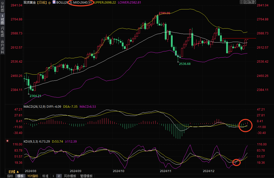 从技术面来看,MACD金叉运行,KDJ金叉运行,布林线轨道收口后接近水平运行,金价周四顶破了布林线中轨关键阻力,近两周高点阻力也被顶破,目前正试探55日均线2663.60附近阻力,如果向上突破,则金价后市有望进一步上探布林线上轨2698.17附近阻力,也可以参考2700关口。12月16日高点阻力也在55日均线附近,在顶破该位置前,金价仍有回踩布林线中轨支撑的可能性,布林线中轨2640.49已经转化为初步支撑所在,5日均线支撑在2633.50附近,100日均线支撑在2623.32附近,如果意外回落至该位置下方,则削弱看涨信号。