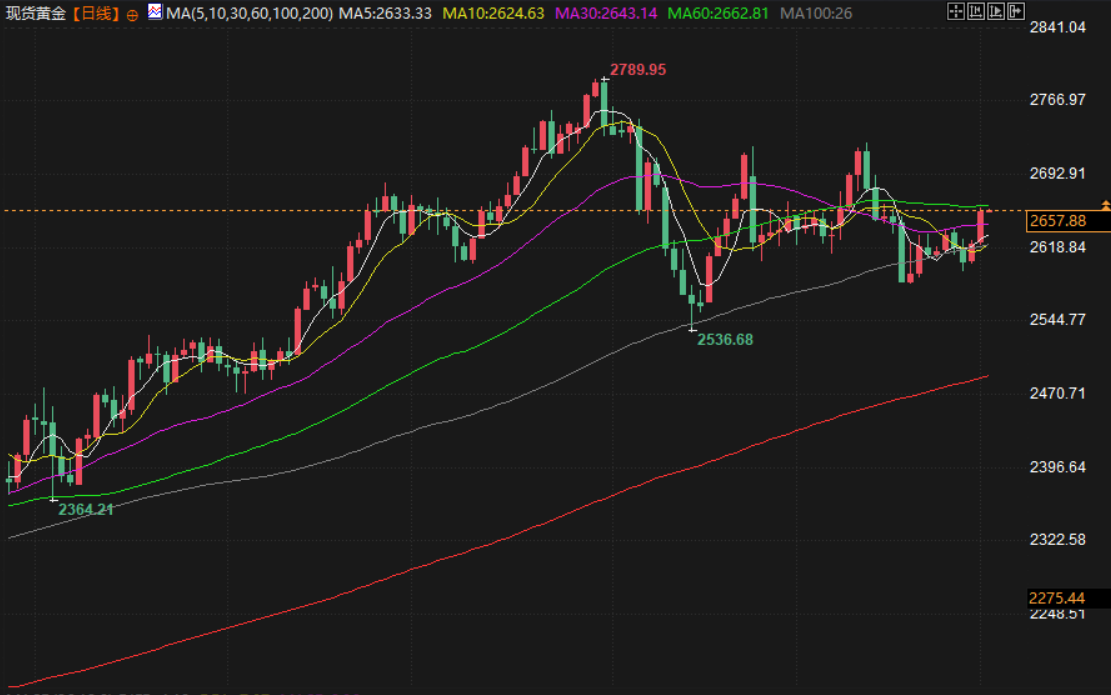 现货黄金交投于2657.80附近,金价周四触及逾两周最高,受避险买盘推动,市场评估美联储利率前景和美国当选总统特朗普贸易关税提议的可能影响;
