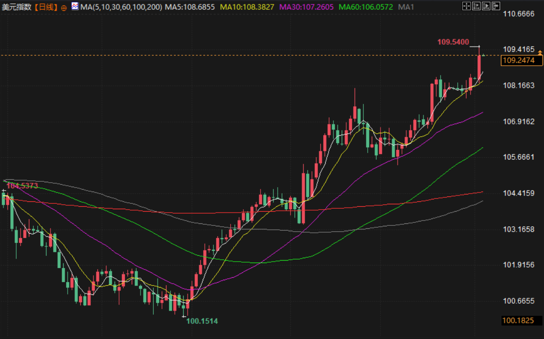 美元指数尾盘上涨0.77%,报109.38点。欧元下跌 1.01% 至 1.025 美元,为 2022 年 11 月以来最低。欧元在跌破 1.03 美元关口后加速下跌,表明技术因素正在加深抛售。交易商预计欧洲央行将在2025年大幅降息,市场预计至少会有四次25个基点的降息,而对美联储有两次这样的举措都不确定。