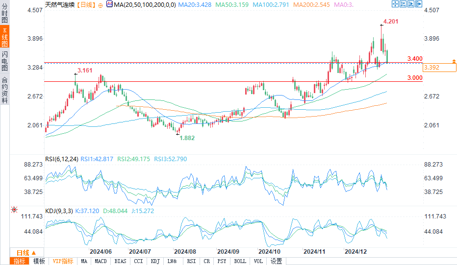 库存过剩限制上涨潜力美国能源信息署(EIA)报告称,截至12月20日当周,天然气库存减少了930亿立方英尺,低于市场一致预期的1000亿立方英尺。库存中的总工作气量为35290亿立方英尺,比五年平均水平高出1660亿立方英尺。尽管有寒冷天气预报,但这一过剩情况仍继续给看涨的交易员带来压力。
