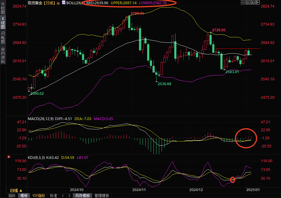 现货黄金窄幅震荡,目前交投于2640.18美元/盎司附近,正好在布林线中轨附近。金价上周五从三周高位回落,收报2639.62美元/盎司,跌幅约0.69%,美国1月ISM制造业PMI数据强于市场预期,美债收益率走强,令金价承压,同时市场为美国当选总统特朗普执政后可能出现的经济和贸易转变做准备。