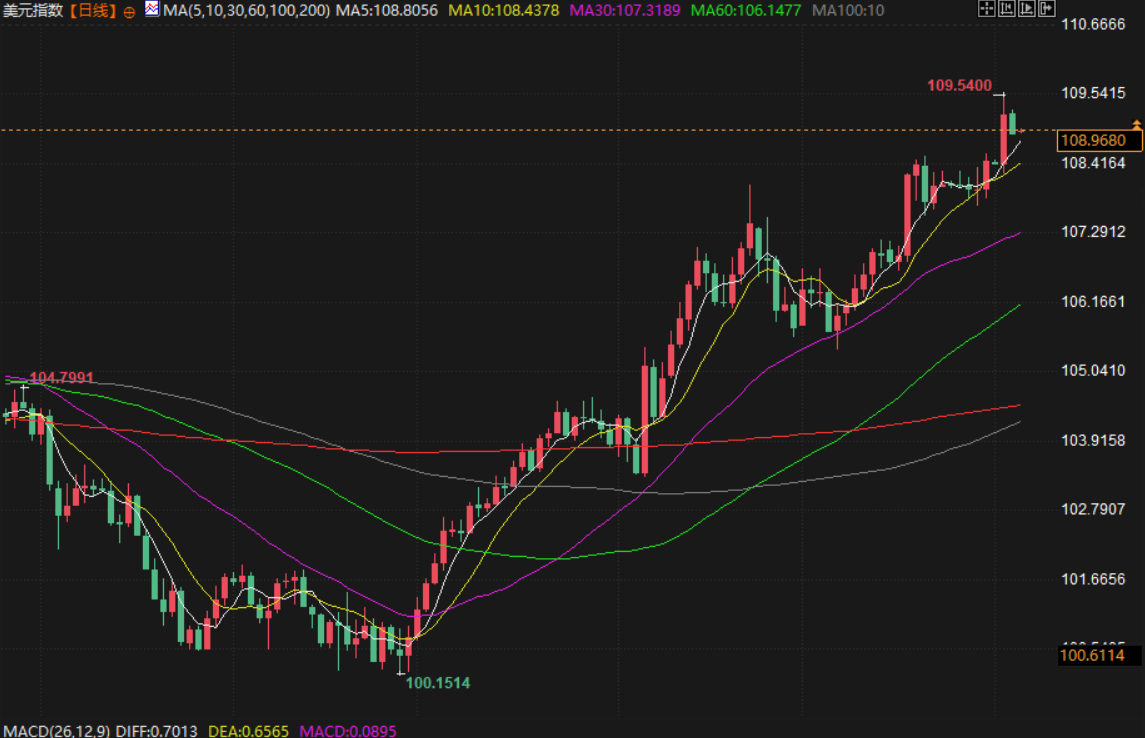 即将上任的特朗普政府的新政策,包括放松商业监管、减税、遏制非法移民和加征关税,预计也将促进经济增长,并增加价格压力。美元指数在上周四触及两年高位 109.54 后,周五下跌 0.28%,报 108.91,上周上涨0.85%。