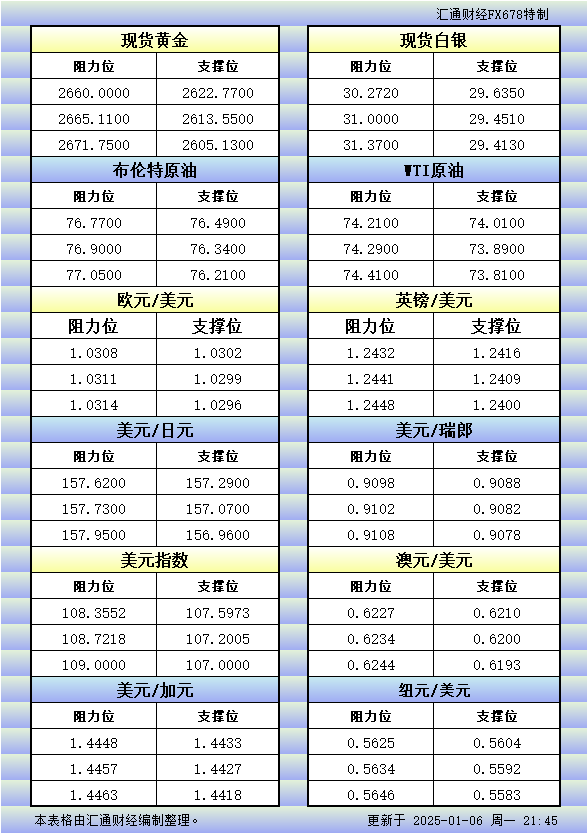 标题:1月6日美市更新的支撑阻力:金银原油+美元指数等八大货币对