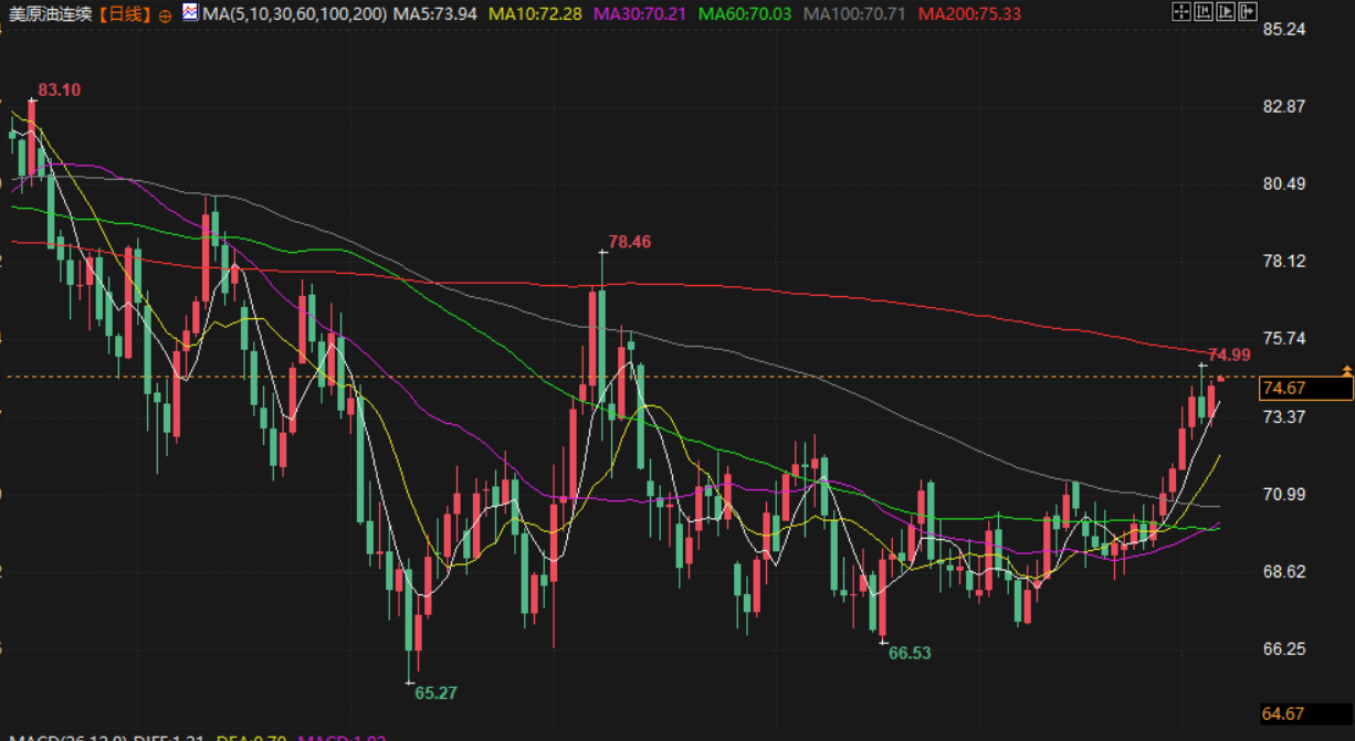 美原油微涨,交投于74.73美元/桶附近,受西方制裁导致俄罗斯和伊朗供应受限的担忧以及需求增加的预期推动。