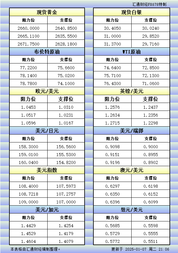 标题:1月7日美市更新的支撑阻力:金银原油+美元指数等八大货币对