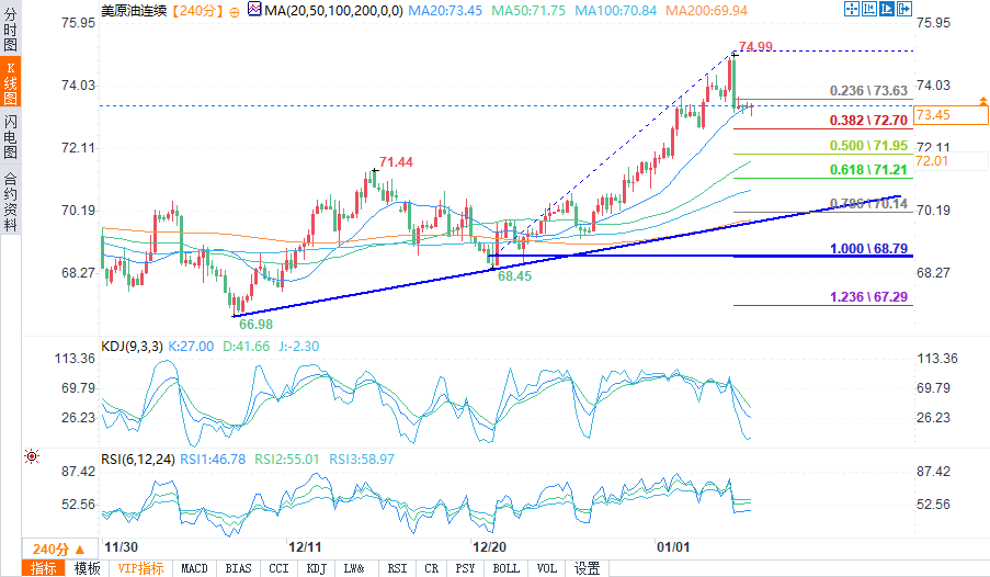 汇通财经APP讯——周二(1月7日)欧盘时段,WTI原油小幅走跌。近日,西德克萨斯中质原油(WTI)价格开始新一轮上涨,上破了71.50美元一线。在4小时走势图上,一条上升趋势线正在形成,其支撑位在71.20美元。