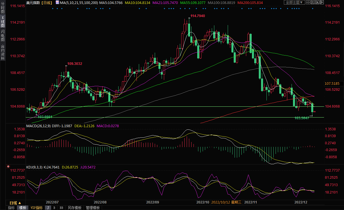 周二美元全面下挫,盘中一度下跌1.34%,创近五个半月新低至103.56,收盘下跌0.95%,收报104.02,为近一周半最大单日跌幅。因此前数据显示美国上月消费者物价通胀率低于预期,强化了美联储在周三为期两天的会议结束后将放缓加息步伐的预期。