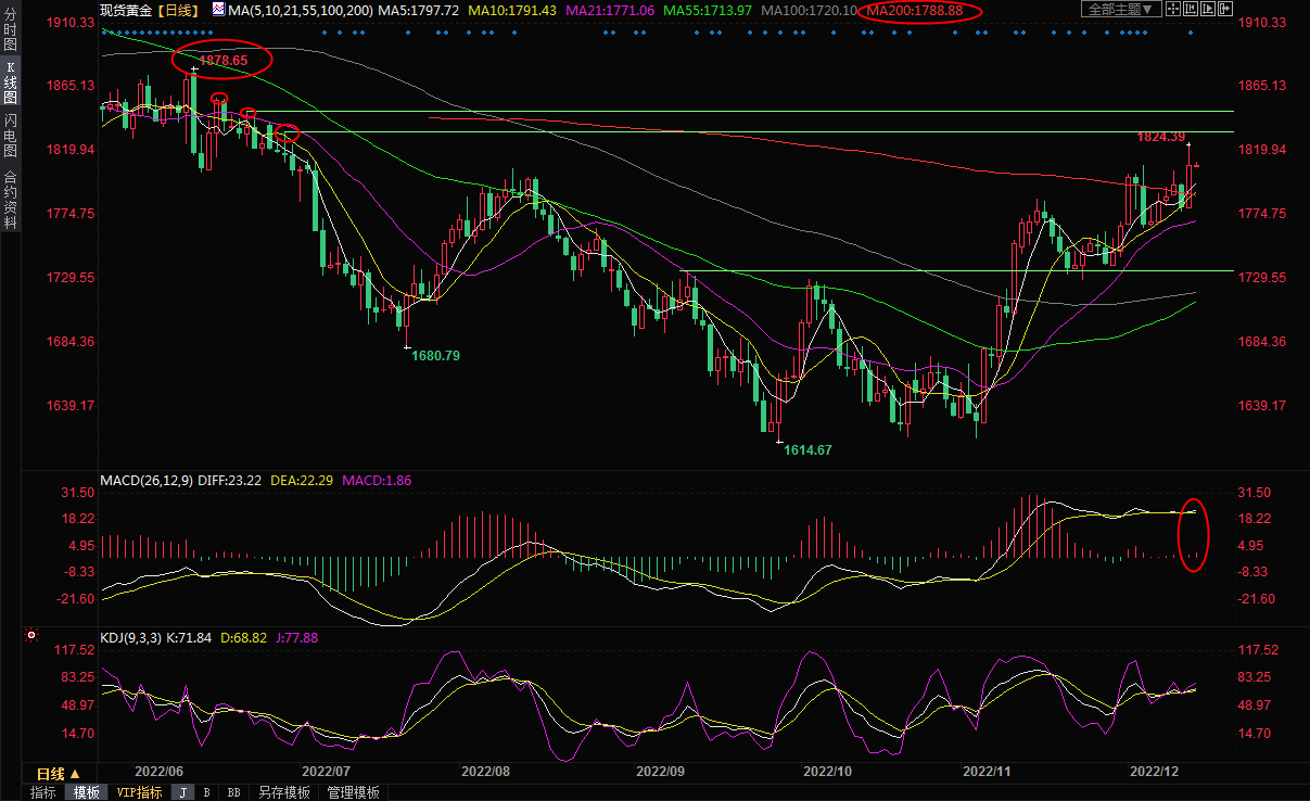 需要提醒的是,投资者还需要特别关注美联储主席鲍威尔的讲话,上个月美联储决议公布之际,金价一度从1649附近拉升至1669附近,但在鲍威尔表示终端利率将高于预期后,金价有涨转跌逾30美元至1635美元附近,并在随后的一个交易日一度跌至1616附近。技术面来看,金价目前回升至200日均线上方,并初步突破了8月份高点1807.72附近阻力,短期均线多头排列,短线看涨信号有所增强,有望启动新一轮涨势,中线分别关注6月22日高点1847.69附近和6月13日高点1878.65附近阻力。不过,MACD再度发出顶背离信号,KDJ接近超买区域,仍需提防假突破和冲高回落的可能性,下方关注1800关口和200日均线1788.89附近支撑。