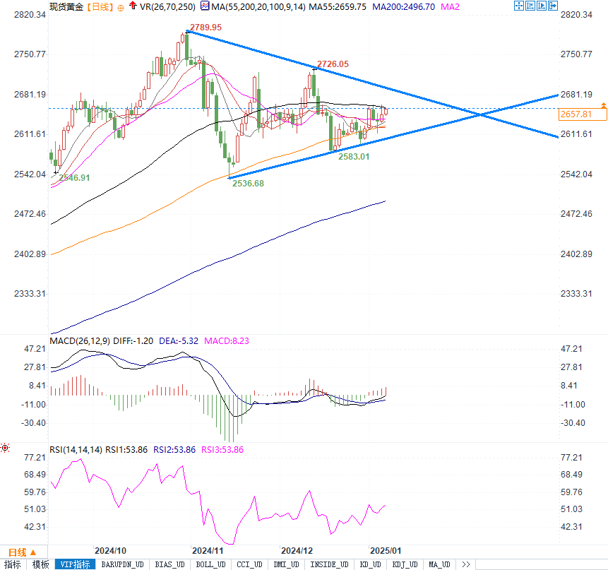 展望:如果黄金价格能够突破55日均线,则可能吸引更多多头入场,推动金价上行至2686美元的水平。