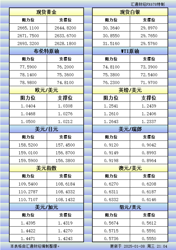 标题:1月8日美市更新的支撑阻力:金银原油+美元指数等八大货币对