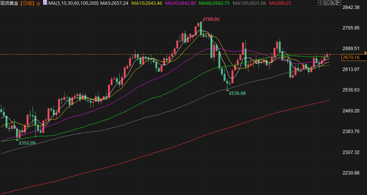 现货黄金交投于2670.27美元/桶附近,金价周四升至近四周最高,受避险需求支撑,同时投资者也在权衡美国当选总统特朗普的政策将对经济和通胀产生怎样的影响。