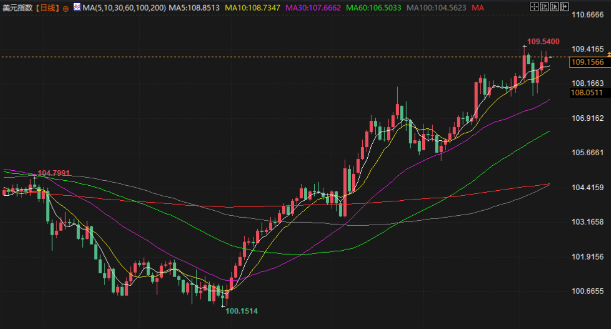 美元周四连续第三个交易日走强,上涨0.12%,报109.15,尽管美国公债收益率下降,但因担心特朗普政府上台后会征收关税而维持在较高水平;英镑近期的疲软走势持续。