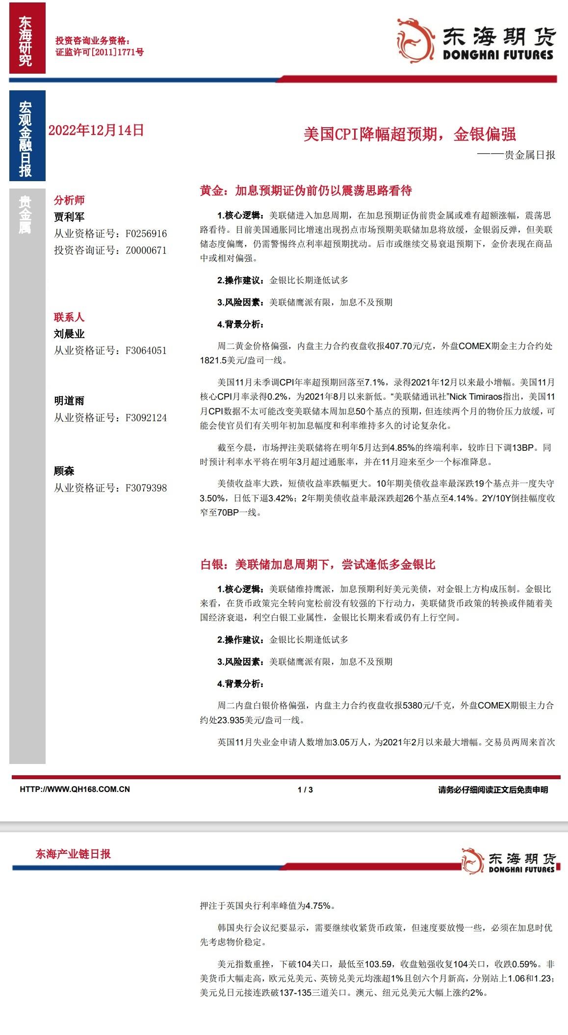 标题:【东海期货12月14日产业链日报】贵金属篇:美国CPI降幅超预期,金银偏强