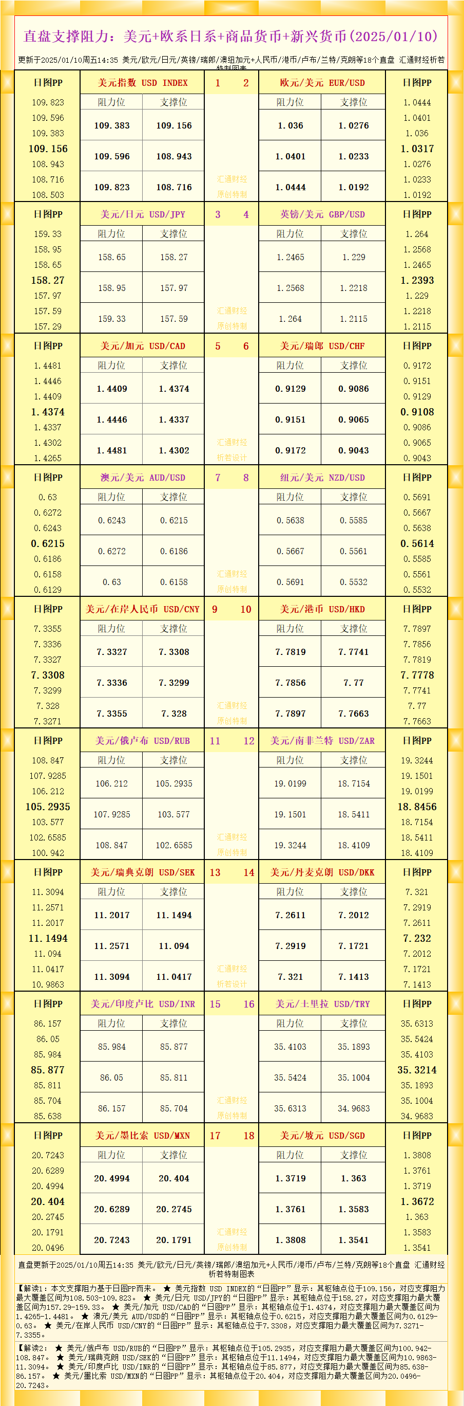 标题:一张图看18个直盘外汇支撑阻力:美元+欧系日系+商品货币+新兴货币(2025/01/10)