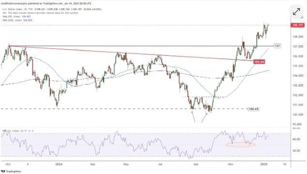 在关键水平109上方呈上升趋势。该指数目前上破109,在就业数据公布前显得很强劲。50日移动均线仍高于200日移动均线,该指数处于二者上方,表明强劲的看涨趋势。该指数的关键支撑位仍在107。