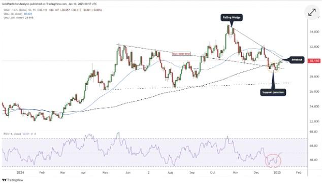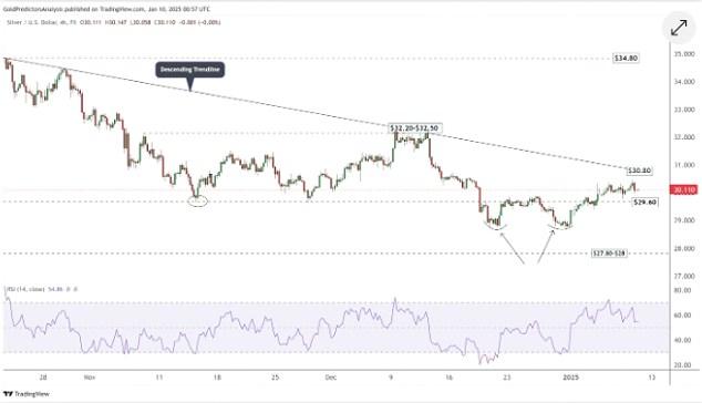 白银日线图显示楔形下降形态的形成,通常被认为是看涨信号。银价收于200日移动均线上方,并在下跌楔形的阻力位附近盘整。此外,银价在楔形支撑位形成了双底,突出了其看涨潜力。