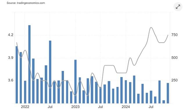 这些趋势表明,美国经济在保持强劲的就业增长方面面临挑战。劳动力市场疲软可能会抑制消费者支出,减缓经济活动,这可能会给美元带来压力。市场预期12月非农就业人数增加15.4万人,11月增加22.7万人。此外,地缘政治紧张局势,如俄乌冲突和中东动荡,进一步增加了市场的复杂性。
