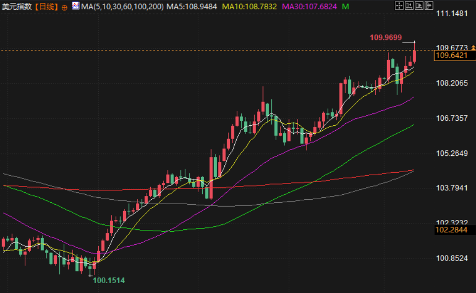 美元指数盘尾上涨 0.4%,报 109.68。此前数据显示,美国12月创造的就业岗位多于预期,强化了美联储将在本月晚些时候的政策会议上将暂停降息周期的预期。
