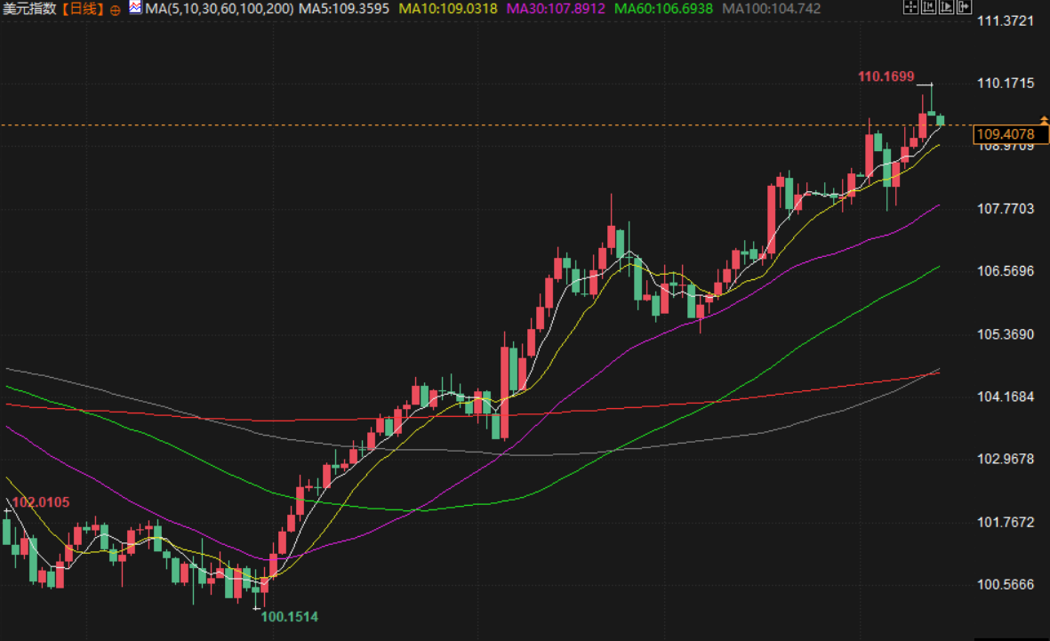 美元指数飙升至逾两年新高,最高触及 110.17 ,延续了近期涨势。