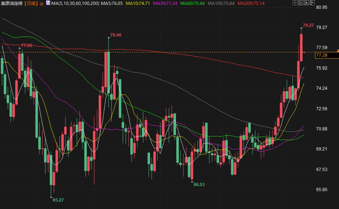 美原油交投于77.27美元/桶附近,油价周一攀升约2%,触及四个月最高,市场预计美国扩大对俄罗斯石油的制裁将迫使印度等国的买家寻求其他供应。