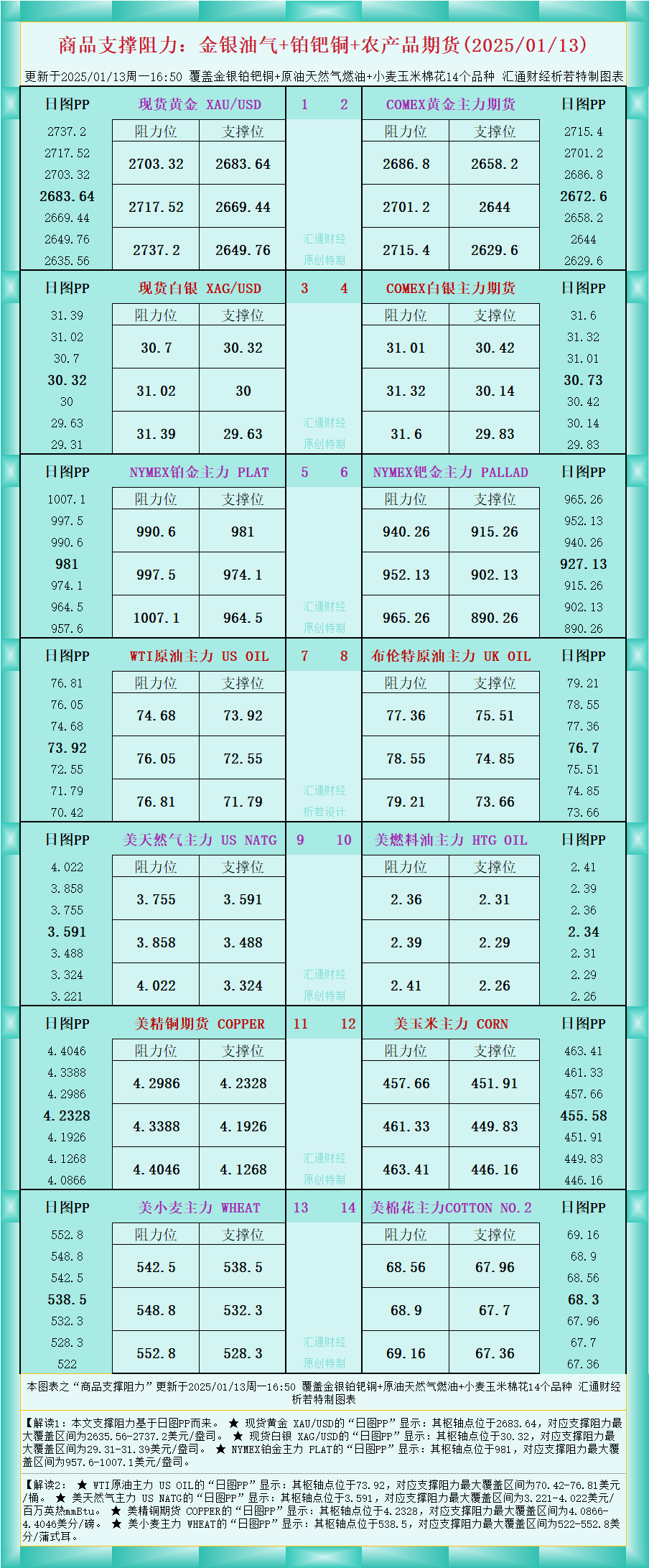 标题:一张图看商品支撑阻力:金银油气+铂钯铜农产品期货(2025/01/13)