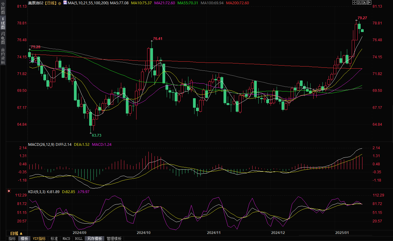 美原油2月期货目前交投于77.70美元/盎司附近。油价周二小幅下滑,此前美国政府机构预测2025年美国石油需求将保持稳定,同时上调了供应预期,在加上过去两周油价涨幅较大,部分多头获利了结也对油价产生拖累。不过,目前油价跌幅受限,因美国对俄罗斯向印度和亚洲大国出口石油实施了新制裁。