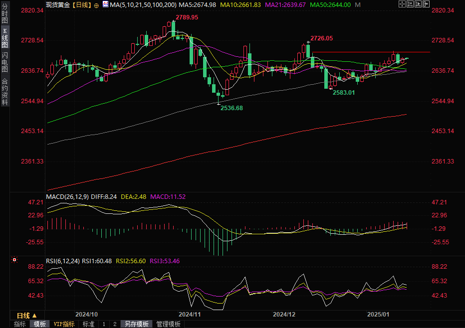现货黄金震荡微跌,目前交投于2675.50美元/盎司。金价周二小幅反弹,收报2677.22美元/盎司,此前美国通胀数据略低于预期,给投资者带来了美联储2025年将继续降低利率的微弱希望,美元应声下跌。另外,对特朗普政策不确定性的担忧也给金价提供支撑,不过,美债收益率继续攀高,令黄金多头有所顾忌。
