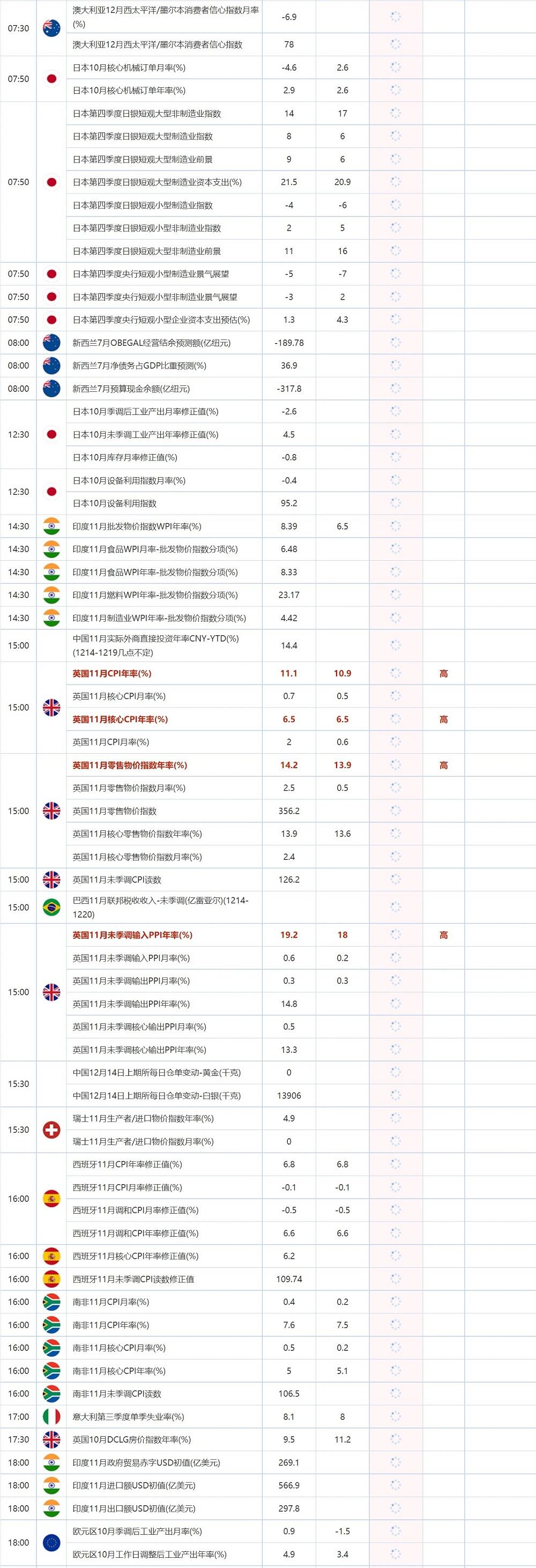 15:00 英国11月CPI年率(%) , 前值 11.1 , 预期值 10.9 , 公布值:待发布15:00 英国11月核心CPI月率(%) , 前值 0.7 , 预期值 0.5 , 公布值:待发布