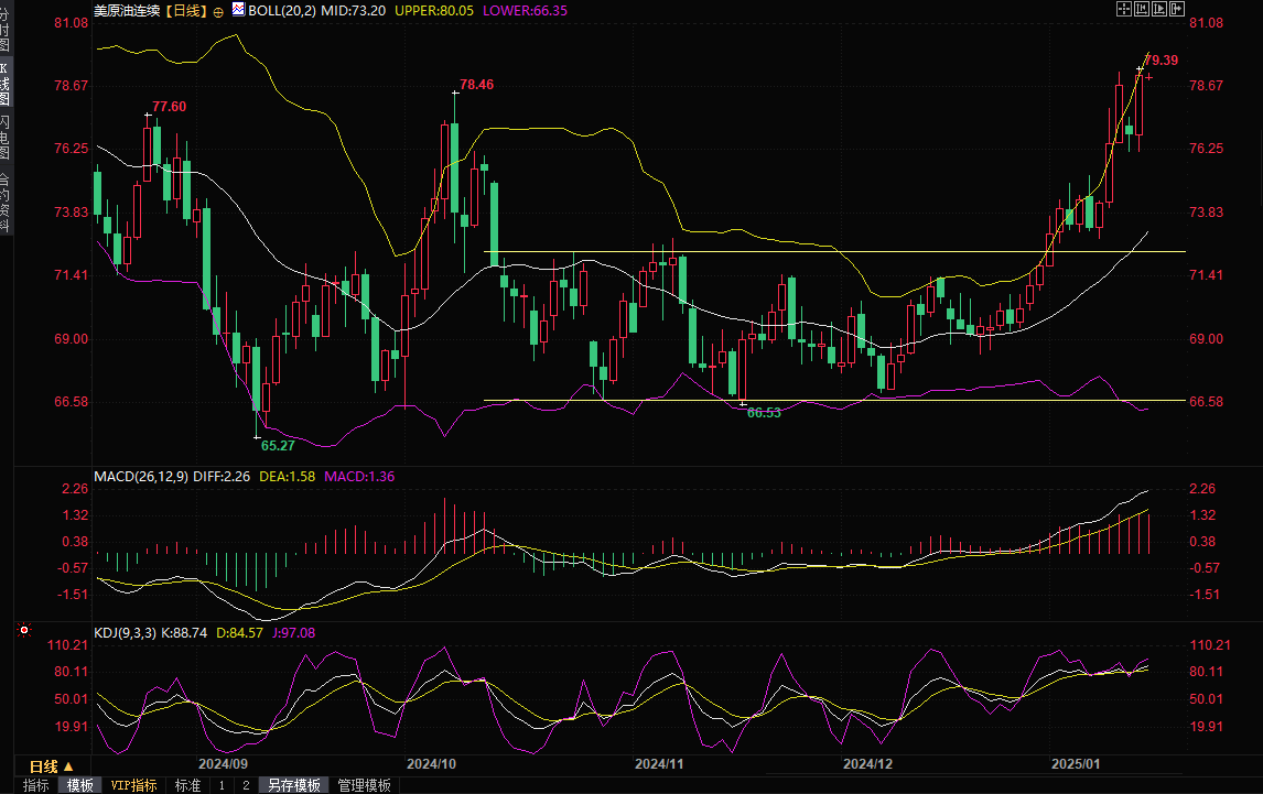 美原油主力合约3月期货目前交投于79.17美元/桶。油价周三上涨逾3%,受助于美国原油库存大幅减少和美国对俄罗斯实施新制裁可能导致供应受扰,尽管加沙停火协议的消息略微限制了油价涨幅。
