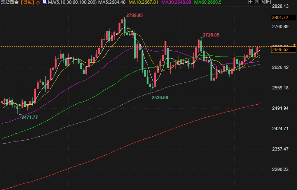 现货黄金交投于2695.65附近,美国核心通胀数据低于预期,通胀压力减弱,美元走低,重新点燃了对美联储宽松周期可能尚未结束的希望;