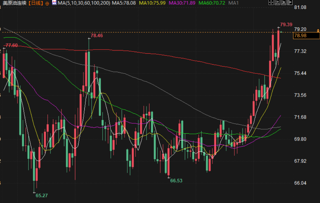 美原油交投于78.96美元/桶附近,油价周三上涨逾2%,受助于美国原油库存大幅减少和美国对俄罗斯实施新制裁可能导致供应受扰,加沙停火协议的消息限制了油价涨幅。