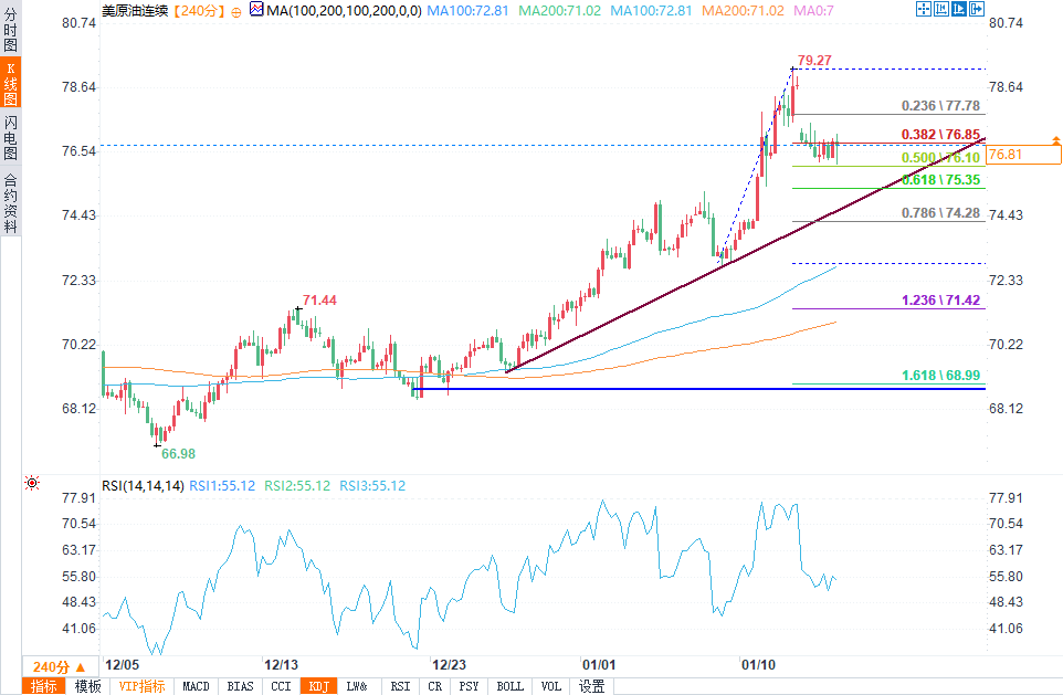 价格高点与回调:多头一度将价格推高至78.00美元上方,高点达到79.28美元,目前正在巩固涨幅。从72.92美元的低点到79.28美元的高点的上涨过程中,价格出现了小幅回调,跌至23.6%的斐波那契回撤位。