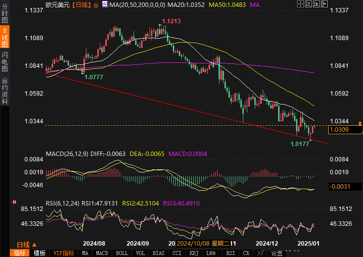 然而,尽管有短期反弹的迹象,EUR/USD的中期走势依然看跌。当前的短期到长期指数移动平均线(EMA)均呈下行趋势,显示出欧元持续面临下行压力。此外,ING分析师指出,虽然欧元短期内存在一定的反弹空间,但从根本上看,由于美联储政策的相对强势以及欧元区经济的不确定性,欧元仍难以持续强势表现。