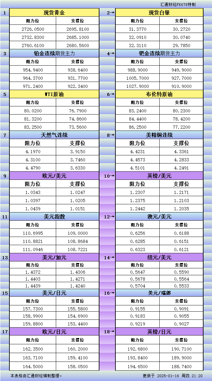 标题:1月16日美市更新支撑阻力:18品种支撑阻力(金银铂钯原油天然气铜及十大货币对)