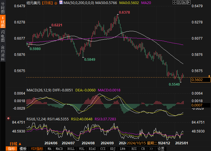 纽元兑美元的短期交易区间仍在0.5600至0.5650之间,这一范围已成为市场关注的焦点。技术指标显示,纽元需要突破0.5650并稳定在该水平之上,才能为进一步上涨打开空间。在这一过程中,0.5580的支撑位起到了较强的支撑作用,短期内若跌破该水平,可能会加剧下行压力。