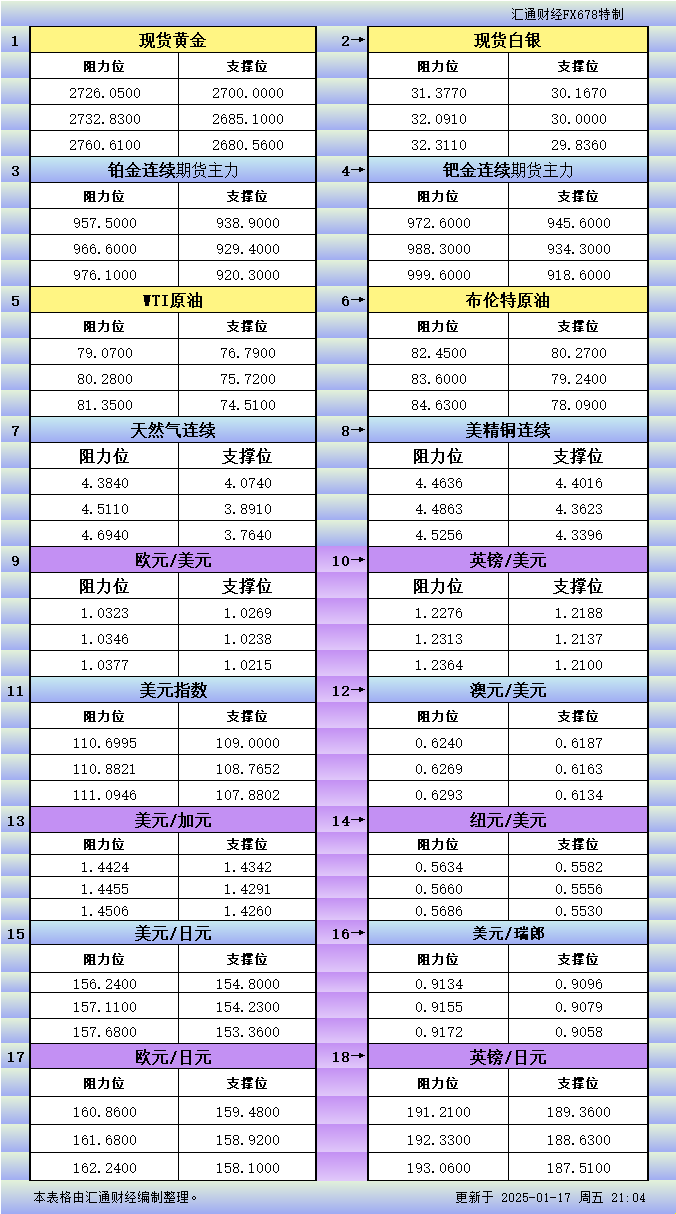标题:1月17日美市更新支撑阻力:18品种支撑阻力(金银铂钯原油天然气铜及十大货币对)