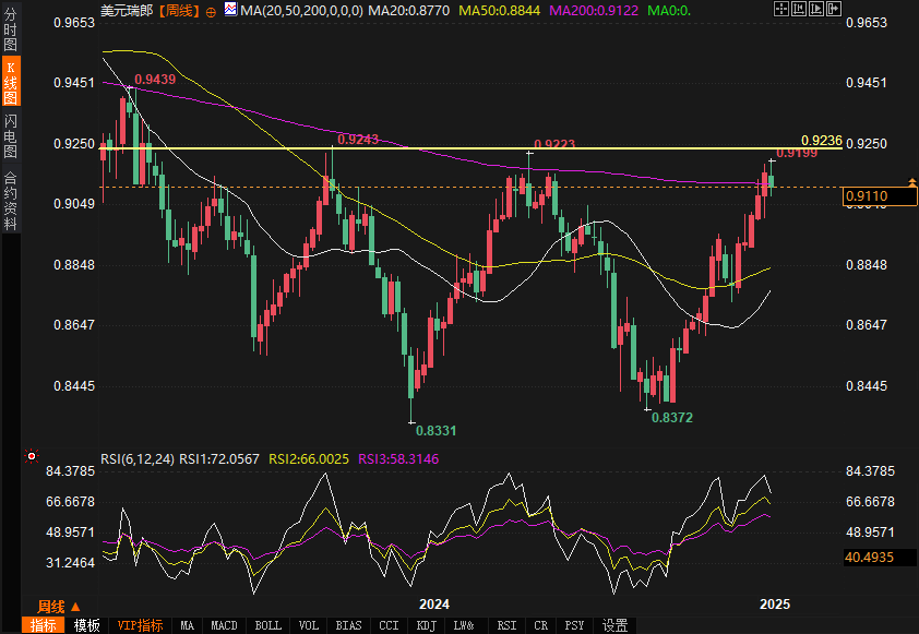 美元兑瑞郎(USD/CHF)略微回调至0.9100附近,尽管美国经济数据对美元形成支撑,但瑞郎在主要货币中的表现依然较强。市场正密切关注美国总统特朗普即将举行的就职典礼,以及其可能出台的经济政策,尤其是关税政策和税制改革。这一背景下,瑞郎的强势表现和美元的震荡走势,使得