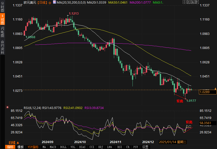 欧元/美元的走势依旧受到政治与经济不确定性交织的影响。特朗普即将上任并推出经济政策,市场高度关注这些政策如何影响全球贸易格局以及美国经济的未来走向。同时,欧洲央行的鸽派政策立场和欧元区经济的持续困境,也给欧元带来了沉重的压力。