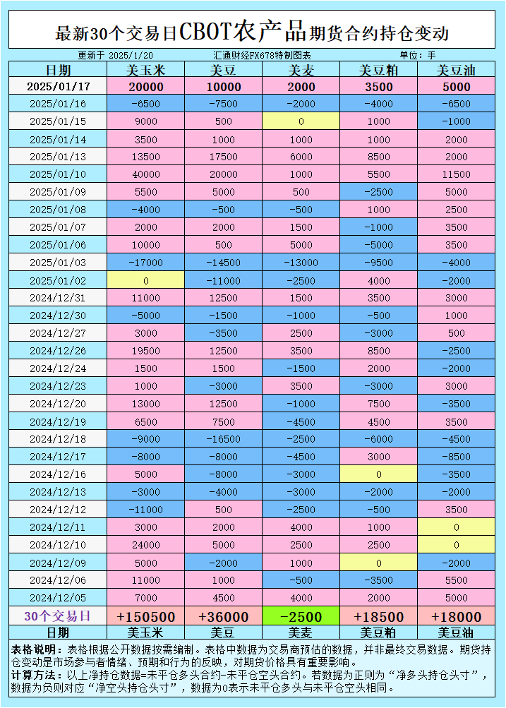 综合来看,CBOT谷物期货市场在1月中旬的走势反映出投资者情绪的波动。持仓数据的变化显示,大宗商品基金对玉米、大豆、豆油等品种的多头情绪较为明显,尤其是在全球供应不确定性加剧的情况下。天气变化、贸易政策以及南美地区的生产前景将继续影响市场走势。