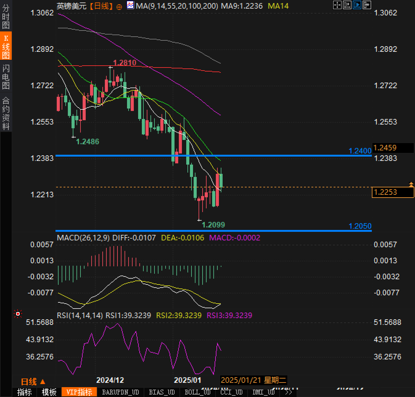 尽管英镑在周二(1月21日)一度突破近日新高,达到了1.2345,但随后回落。英镑/美元汇率未能重新突破20日均线,显示出短期内上涨的动能有所减弱。