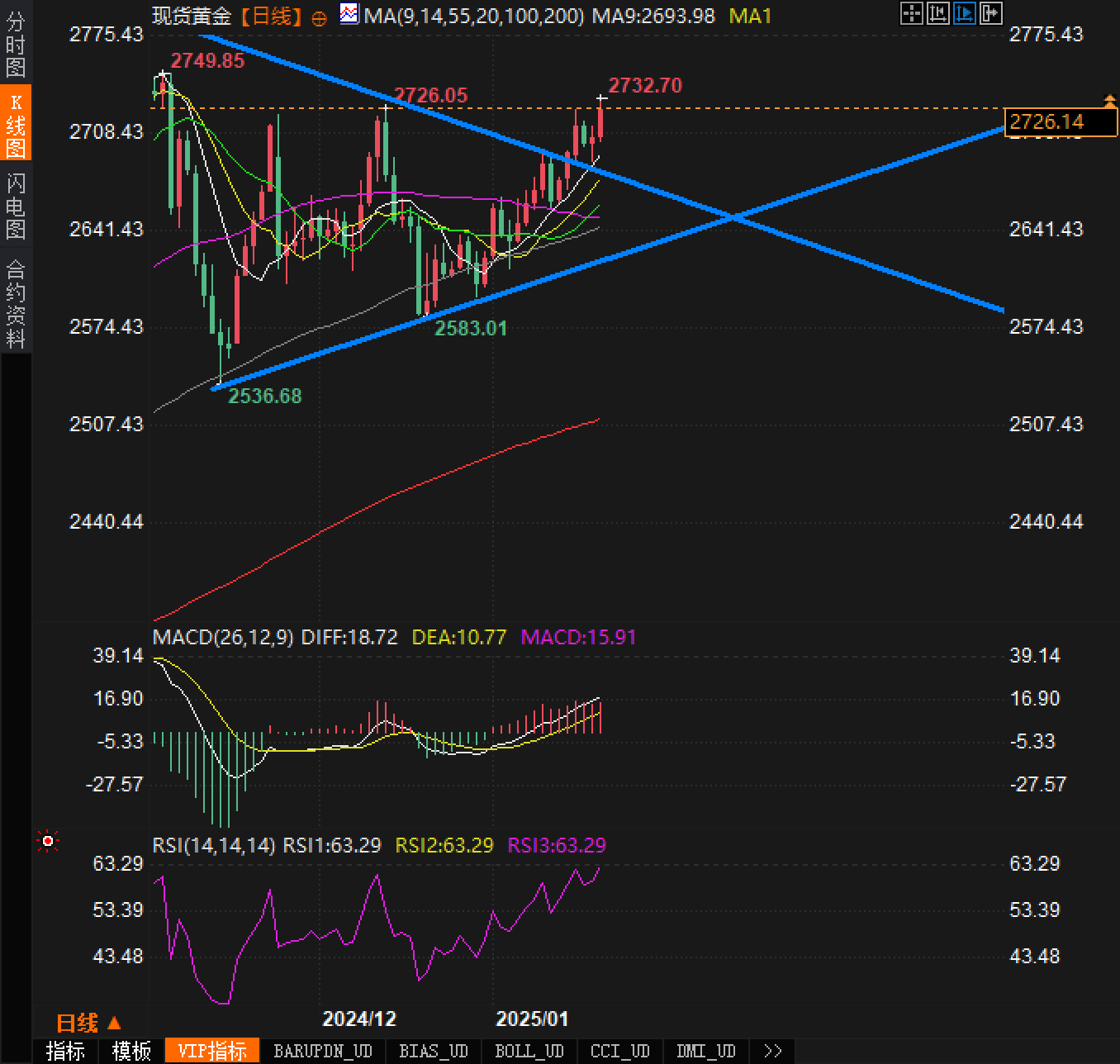 然而,若出现获利回吐,黄金价格可能会回落至2700美元附近,并且以2668美元的水平作为支撑。若价格进一步下行,接下来需要关注55日均线和100日均线的交汇处,约为2646美元,这将是进一步调整的关键支撑位。