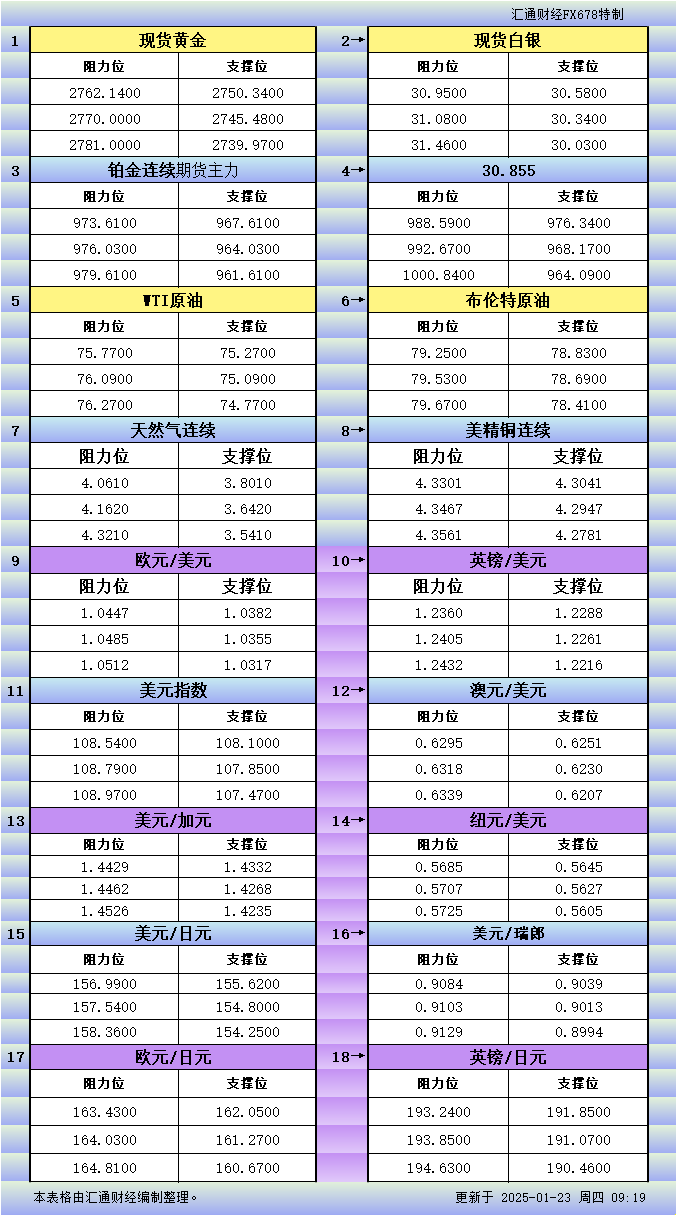 标题:1月23日亚市更新支撑阻力:18品种支撑阻力(金银铂钯原油天然气铜及十大货币对)
