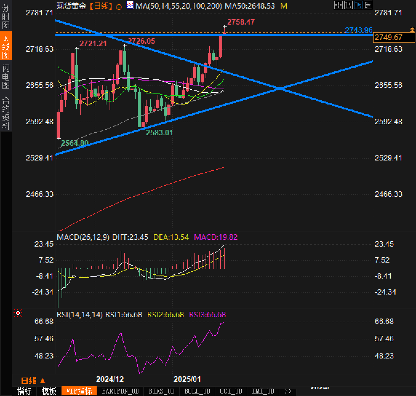 阻力水平:上方首个阻力位在2759.13美元,突破后可能测试2766.37美元。值得注意的是,黄金K线图中出现了“白三兵”形态,这是一种典型的看涨信号。如果价格成功突破2759.13美元,预计会吸引更多买盘兴趣,推动价格进一步走高。然而,如果跌破2743.96美元,市场情绪可能转向空头。