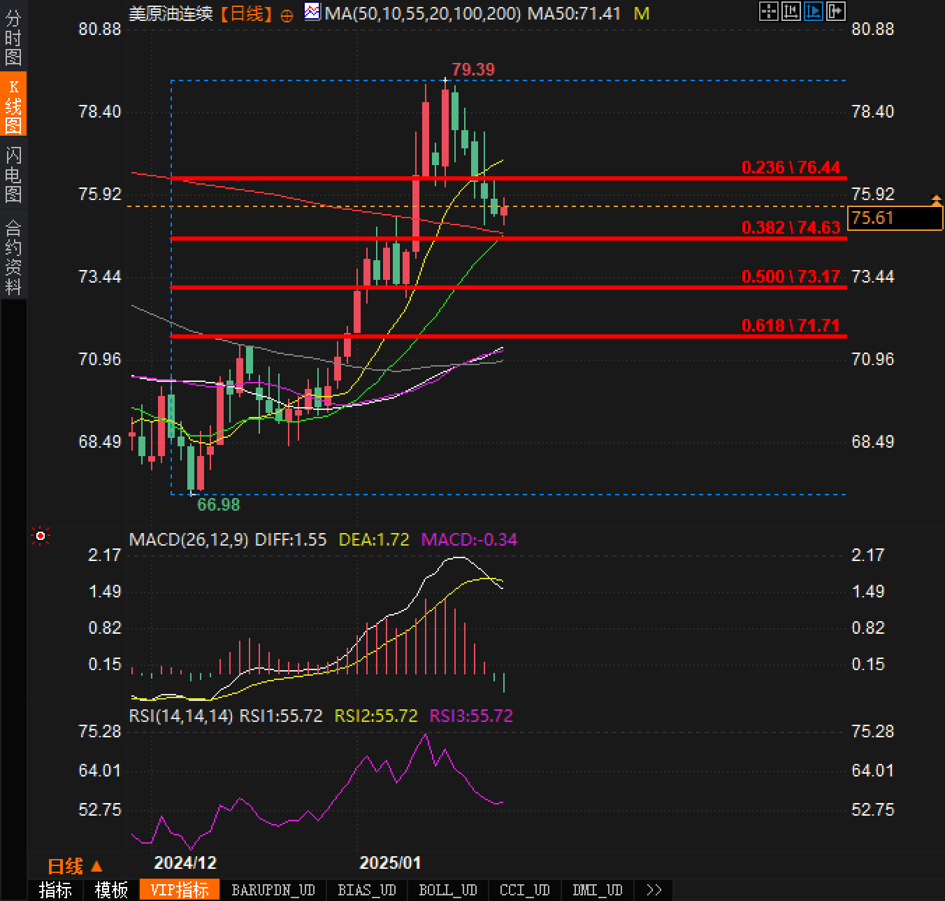 如果油价未能突破这些技术阻力位,可能会继续在当前区间内整理,或者形成新的下行压力。若油价持续维持在当前支撑位之上,则空头可能在74.70美元区域附近进行整固,为下一轮下行做准备。若油价跌破200日均线,则可能意味着市场将进入新的下行趋势,空头力量将重新占据主导地位。