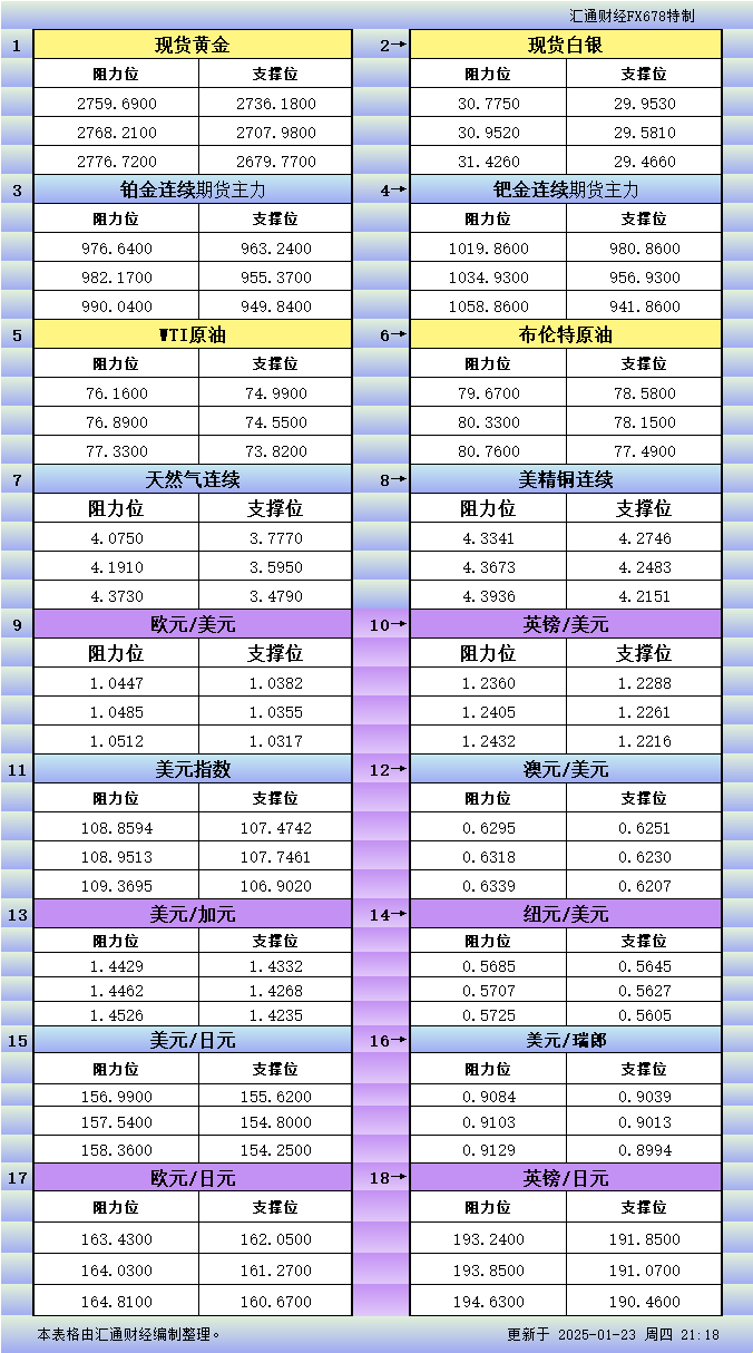 标题:1月23日美市更新支撑阻力:18品种支撑阻力(金银铂钯原油天然气铜及十大货币对)