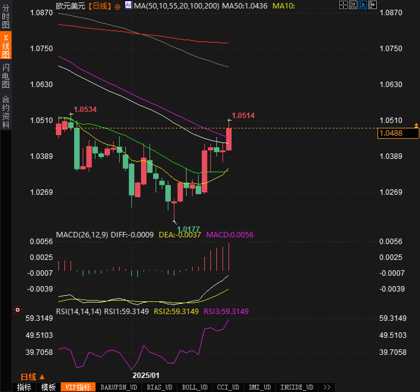 总体来看,欧元/美元近期的上涨势头明显,尤其是在突破1.0421后,价格一度触及1.0514,当前整体上多头趋势仍然较强。市场关注1.0514和1.0600的技术阻力位,一旦突破,汇价可能继续上行。而若价格回调,支撑位仍然位于1.0421附近。