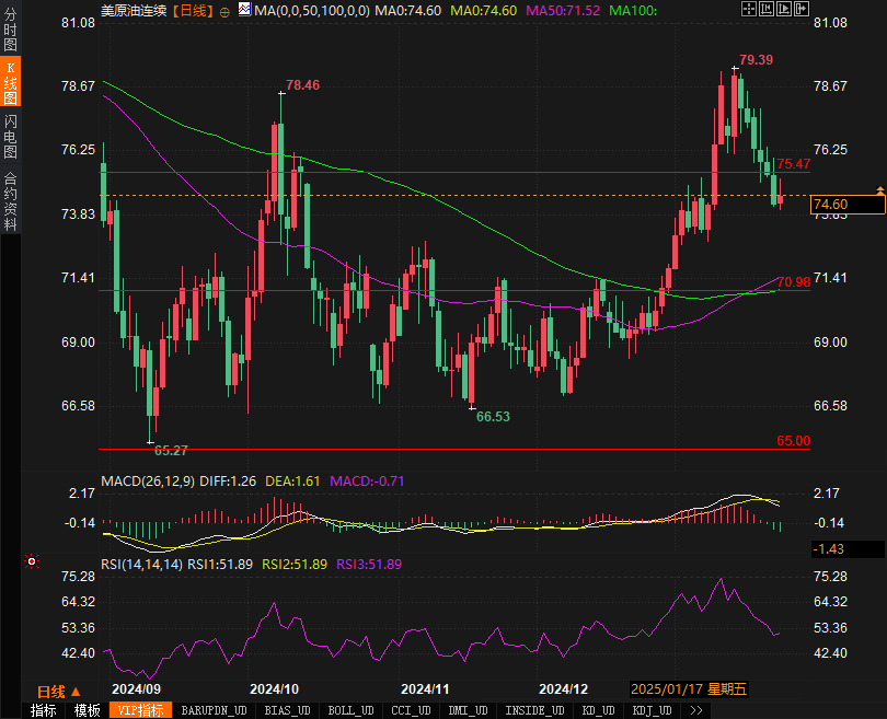 本周总结整体来看,本周原油市场受到政策变动、供应和需求矛盾的综合影响,价格显著下跌。特朗普的能源政策、OPEC的潜在回应以及库存变化共同构成了本周市场的主要驱动力。技术面显示,短期内原油价格仍面临下行压力,关键支撑位将受到市场密切关注。