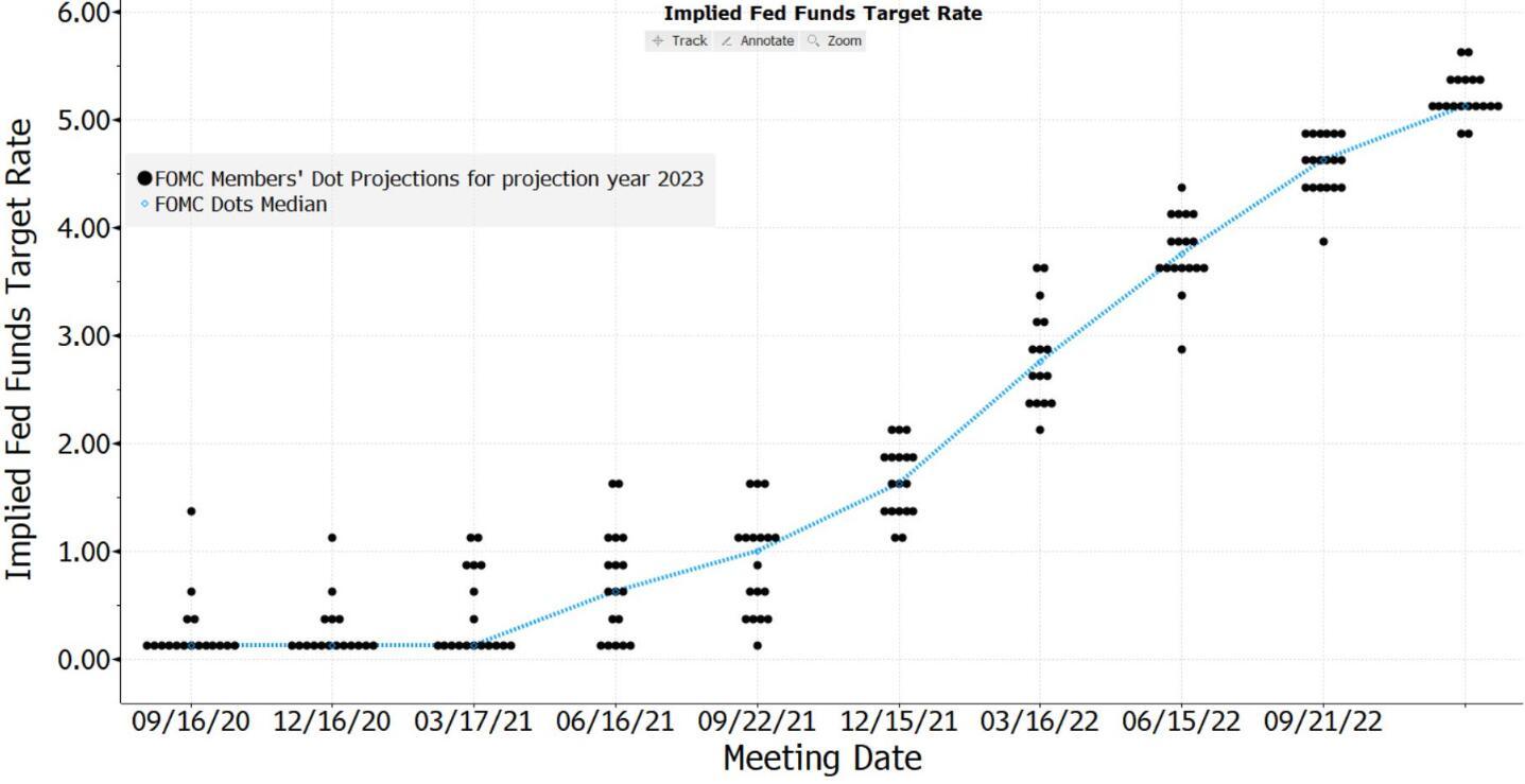 George Goncalves指出,2023年点阵图利率预测聚集在5%以上,只有两个点位低于这一水平,表明FOMC成员站在同一立场上。这对市场的影响是:在经济、市场或两者都出现问题之前,他们不会冒险,除非达到总需求,降低工资,并切断工资-价格螺旋上升的可能性。